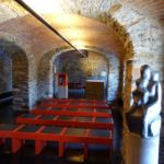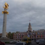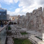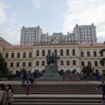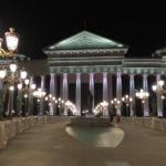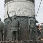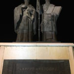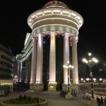 La seconda sorpresa è data dall’imponenza monumentale del centro. Le fotografie ne sono una testimonianza impressionante. Alla ricerca di un’identità nazionale – ma verosimilmente le ragioni sono più complesse –, la classe politica al potere ha investito nell’ultimo decennio somme incredibili di denaro per creare un centro di una pomposità senza pari. La smisurata statua di Alessandro fa la sua parte dominando una vasta area delimitata da palazzi immensi, corredati di colonne romane e di ogni sorta di elementi decorativi. L’atmosfera ha del surreale, ma non è priva di uno strano fascino, alimentato anche dalla musica classica che sprigiona dagli altoparlanti disposti sui candelabri in buona parte della piazza. Ovunque si volga lo sguardo: fontane statue, ponti, palazzi, il tutto in uno strano stile classicheggiante e imperiale, che la sera si presenta in una straripante effusione di luci… Tra l’altro anche le statue di Cirillo, che già abbiamo avuto modo di conoscere…, e Metodio. Sui ponti che attraversano il fiume Vradar una miriade di statue di figure della storie e della cultura mecedone. Il museo di archeologia, ubicato in uno di questi palazzi, non fa eccezione: una infinità di oggetti esposti, come se la quantità potesse in un qualche modo supplire alla qualità.