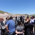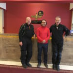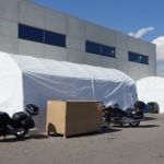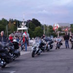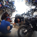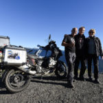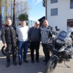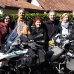 Vor dem Abschied gibt es nochmals ein Fotoshooting mit allen, vor dem an der Wand deutlich sichtbares Bild des Patents des Ekogeräts… auf den Motorrädern…